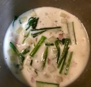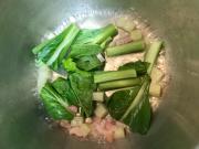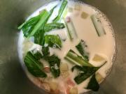 ![]() ①鍋に、だし、じゃがいもを入れ茹でる。次に、小松菜ベーコンを加え茹でる。