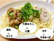 大根はおろし器で大根おろしにする。 納豆とオクラ、ツナとマヨネーズをあわせます。