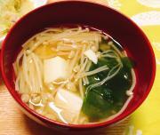 鍋にだし汁、えのき、豆腐を加え煮る。 火が通ったらわかめをいれる。