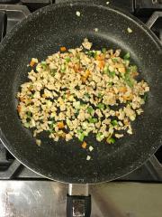 ![]() 油を引いたフライパンでひき肉を炒め、色が変わったら①の野菜を入れる。