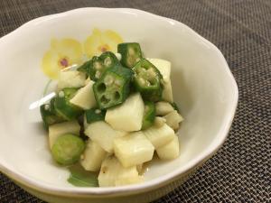 オクラは塩もみをして2分ほどゆで、ゆでたオクラは水気をふき取り1㎝の輪切りにする。