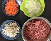![]() 玉ねぎ、人参、エリンギをみじん切りにする。