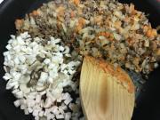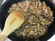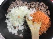 ![]() ひき肉に火が通ったら玉ねぎと人参を加え炒める。