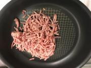 ![]() フライパンにひき肉を入れ炒める。