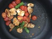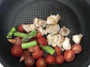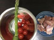 ![]() 食材はこちら 鶏肉とアスパラは一口大、トマトは半分に切ります。 アスパラはラップをしてレンジで加熱します。