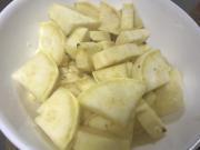 ![]() 火が通りやすいように小さく切り、柔らかくなるまでラップをしてレンジで加熱する。(箸などがすっと通る程度)