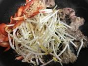![]() 牛肉に火が通ったら赤ピーマン、もやし、だしの素を入れ炒める。