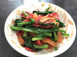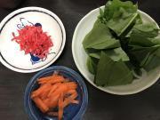 ![]() ほうれん草は食べやすい大きさに、人参は短冊切りにする。