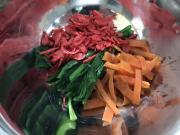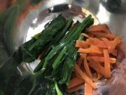 ![]() ほうれん草を手で絞り、人参と一緒にボールに移す。