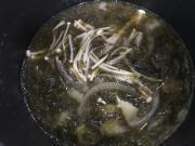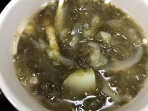 ![]() 残りの水を加え、沸騰直前に火を止めたらアオサを加える。