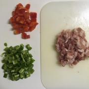 ![]() ピーマンは5㎜角に切り、豚肉も細かく切る。