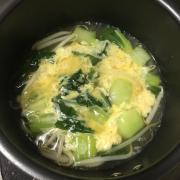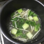 ![]() 中華スープを鍋に沸かし、チンゲンサイ(茎から先に入れる)、もやしを入れる。
