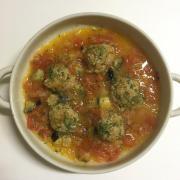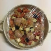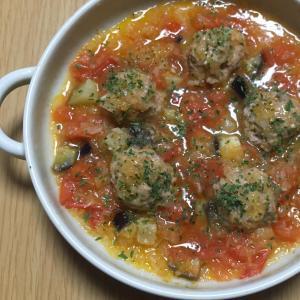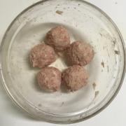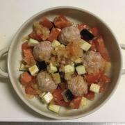 ![]() 耐熱皿に油(分量外)を薄く塗る。間をあけてミートボールを並べ、隙間に④を入れる。