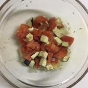 ![]() トマトは粗く刻み、茄子は1cm角に切る。ボールに入れ、玉ねぎ(残りの半量)、Bと混ぜる。