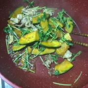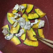 ![]() かぼちゃを加え、崩れないようひっくり返しながら焼く。