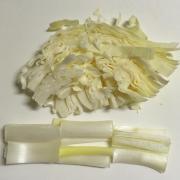 ![]() キャベツは細切りし、白ねぎは縦半分に切ってから5㎝程の長さに切る。