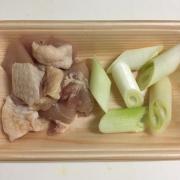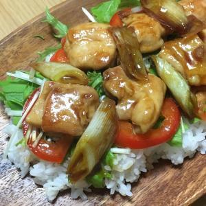 ![]() 鶏肉と白ネギを乗せ、残ったたれをかける。