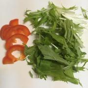 ![]() 水菜はざく切り、赤パプリカは薄切りにする。