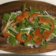 ![]() ご飯の上に水菜と赤パプリカを敷く。