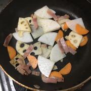 ![]() 根菜を加えて炒める。火が通れば、Aを加える。