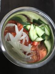![]() ミニトマトは半分に、玉ねぎとキュウリは薄切りにします。