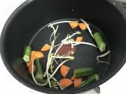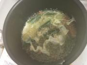![]() 人参に火が通ったことを確認したら、強火にして溶き卵を回しいれる。再度沸騰したら完成。