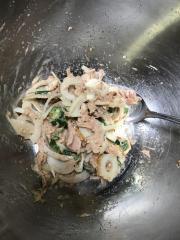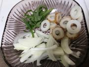 ![]() 玉ねぎとちくわは薄切りに、しそは細切りにする。