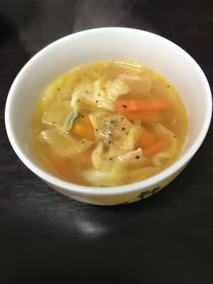![]() 水とコンソメをいれて沸騰したら火を止める。盛り付けて胡椒をふり完成