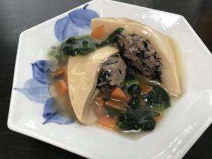 ![]() ひじきを水切りしてひき肉に入れよく捏ねる。高野豆腐は軽く水切りして、三角形に1/2切りし底辺か袋になるように切り込む