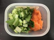 ![]() 小松菜は小さめのざく切りに、人参は薄めのいちょう切りにする。