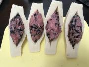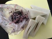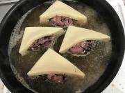 ![]() ひき肉の餡種を、高野豆腐の袋に詰める