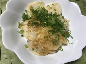 ![]() 山芋は皮をむいて薄切りに、ネギは小口切りにする