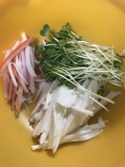 ![]() かいわれ大根の細さくらいにかにかまと長芋を割く(切る)。 ①と和える