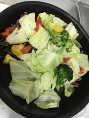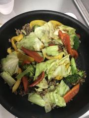 ![]() ブロッコリーは小房に分け半分に切り、レンジで柔らかくします。キャベツは色紙に、赤・黄ピーマンは一口大の乱切りにする。