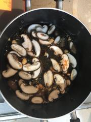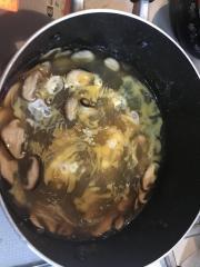 ![]() 1の椎茸とAの材料をいれ、鍋でひと煮立ちさせる。春雨を入れ、袋に書いてある時間の1分短めに煮立たせる(約2分)