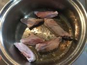 ![]() ごま油とニンニクを鍋で弱火から炒めて、香りが出たら鶏肉を全体が白くなるまで焼く(ここから写真は3人前です)
