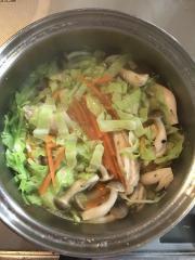 ![]() 野菜から水が出たら水とコンソメを入れて弱火で10分位煮る。