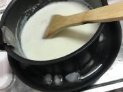 ![]() 沸騰する直前までよく混ぜながら火にかけ、直前で火を止める。手で絞って水気をきったゼラチンを入れたらよく混ぜて溶かす