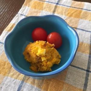 かぼちゃを一口大に切り、皮を剥き、ラップに包み電子レンジ600w1分加熱する。