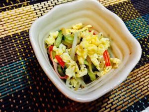 ![]() きゅうりは千切りにて塩を振り、しんなりしたら水気を絞る。カニかまぼこは手で細かくほぐす。