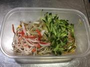 ![]() ドレッシングを合わせたボウルにもやし、きゅうり、かにかまぼこ卵を加え、混ぜる。