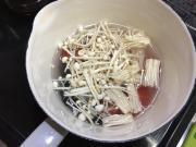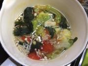 ![]() スープが煮立ったら、カットわかめ、ミニトマト、えのきを加え、ひと煮立ちさせ、レタスを加える。