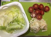 ![]() ミニトマトは半分に切る。 えのきは石づきを落とし半分くらいに切る。 レタスは手で一口大にちぎる。
