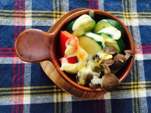 ![]() 耐熱の器にズッキーニ、しめじ、パプリカを入れ、マヨネーズをかけ、ピザ用チーズをのせる。