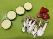 ![]() しめじは石づきを落とし、ほぐす。 パプリカは一口大に切る。 ズッキーニは8mm厚さの輪切りにする。