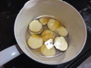 ![]() 鍋に水、マーマレード、さつまいもを加え、煮る。 (水は材料がひたひたになるくらいまで入れる)