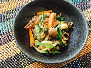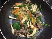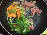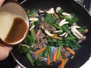 ![]() 牛肉の色が変わってきたら、小松菜の茎、人参を加えて炒める。 しんなりしたら、小松菜の葉、しめじを加え炒める。