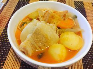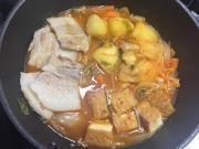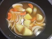 ![]() じゃが芋、玉ねぎ、人参を加え炒め、表面に油が回ったら、水と中華だしの素、コチュジャンを加え、煮る。