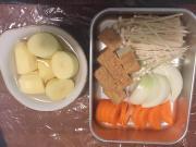 ![]() じゃが芋は皮をむき、大き目の一口大に切る。 たまねぎはくし切り、人参はいちょう切りにする。 えのきは石づきを落とす。