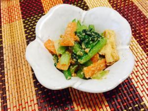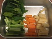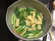 ![]() 鍋に湯を沸かし、人参→小松菜→揚げの順に加え、茹でる。 (火の通りにくいものから加えていく)